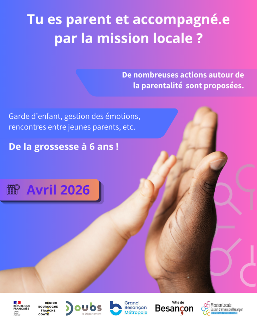De nombreuses actions autour de la parentalité sont proposées. Garde d’enfant, gestion des émotions, rencontre entre jeunes parents, etc. De la grossesse à 6 ans ! Pour s’inscrire aux différents évènements, contacter son/sa conseiller.e ou la référente parentalité de la Mission Locale : lena.jamai@milobfc.fr / 03.81.85.85.01.02 Facebook : léna.Jamaïlmilo / Instagram : lena.milopdn -> Calendrier […]